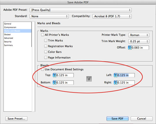 Marks: Generally when sending us a file, we prefer this to be off. We will put them in through our prepress department. Bleeds: Should be .125" for all (This should have been set in the native file as well)