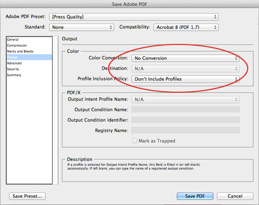 1. Open your PDF dialog box (GENERAL is first highlighted item). Adobe Preset: Press Quality